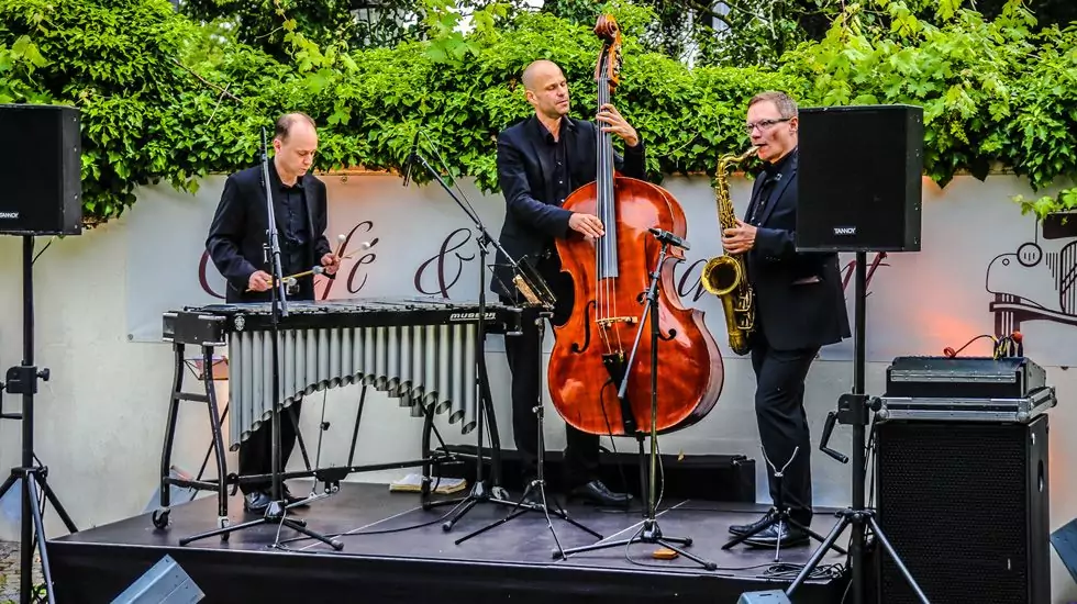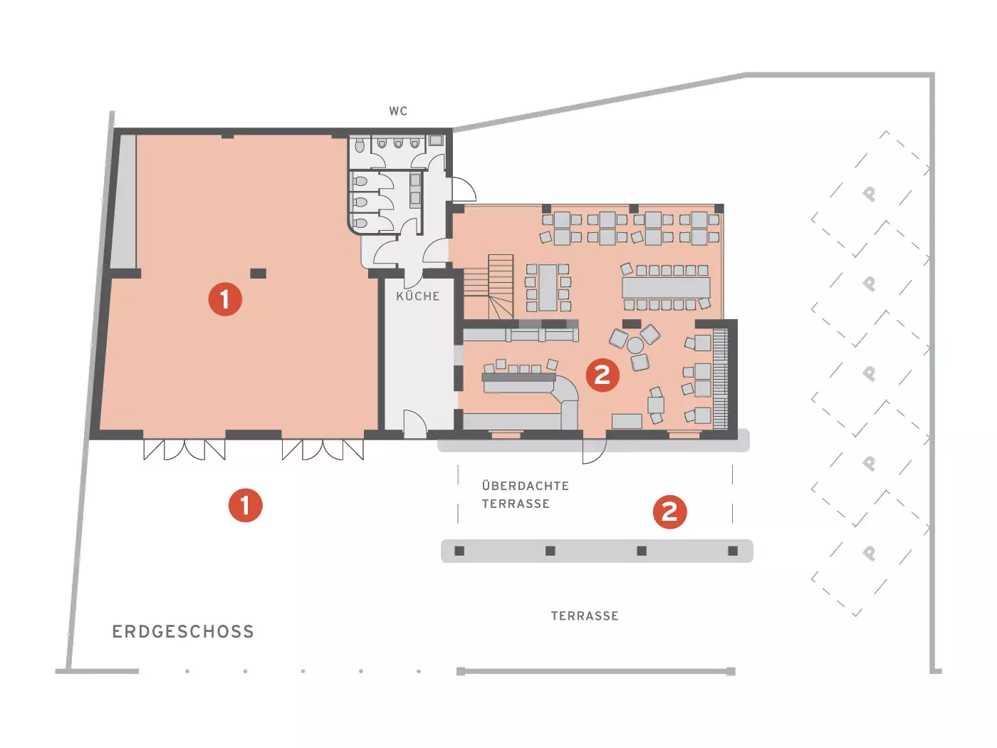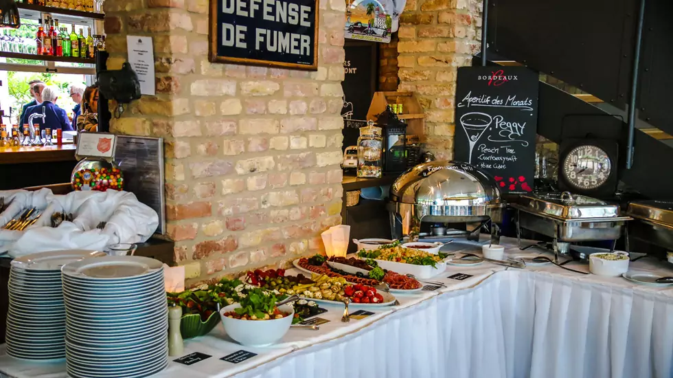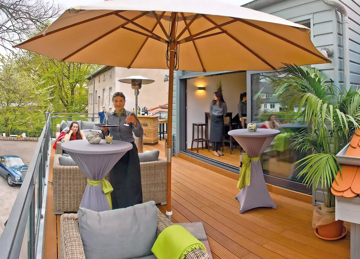 - Tische für bis zu 60 Personen im Innenbereich und für bis zu 80 Personen im Außenbereich