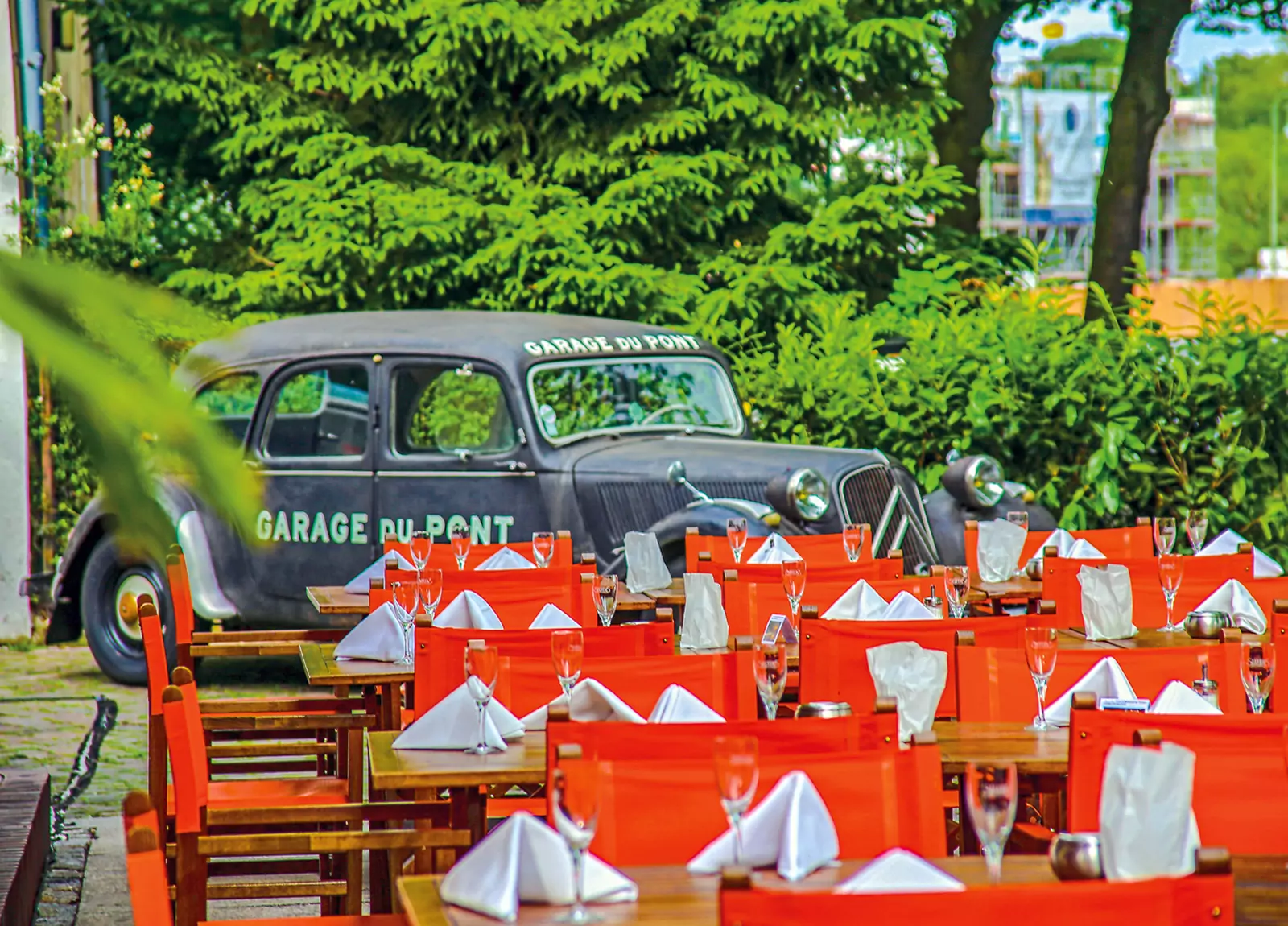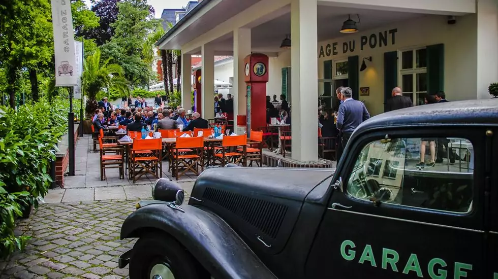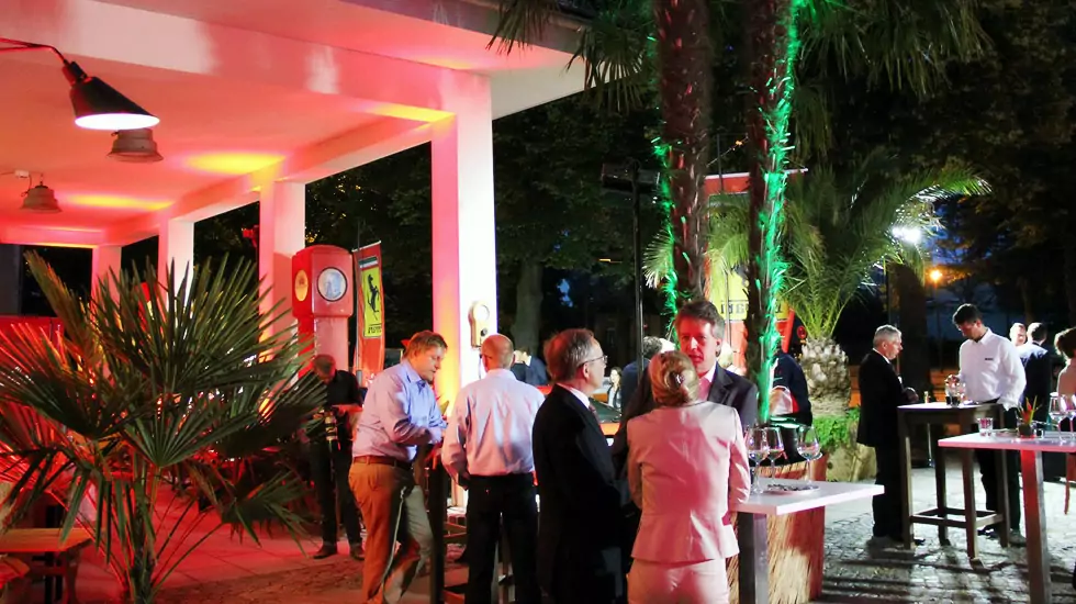Der teilweise überdachte Außenbereich ist der perfekte Platz für einen schönen Sommerabend im Freien. Ob gesetztes Essen, ein Stehempfang oder eine Autopräsentation vor den Toren der GARAGE du PONT – hier gehen wir ganz auf Ihre Wünsche ein und beraten Sie gern persönlich.