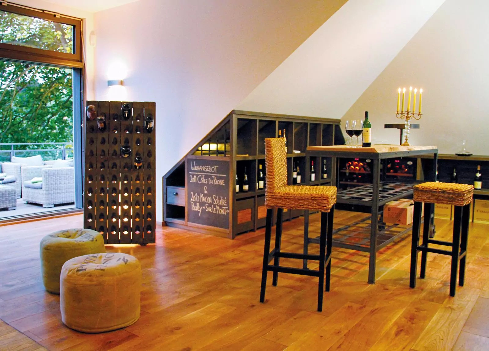 Unsere Weinlounge im Obergeschoss bietet neben einer schönen Aussicht von der Terrasse auch eine kleine Bar mit Wohlfühlcharakter zum Genuss erlesener Weine – ein wunderbarer Ort für eine private Feier mit guten Freunden oder einen exklusiven Empfang für Ihre besten Kunden. Sie lässt sich auch hervorragend als Tagungsraum nutzen.