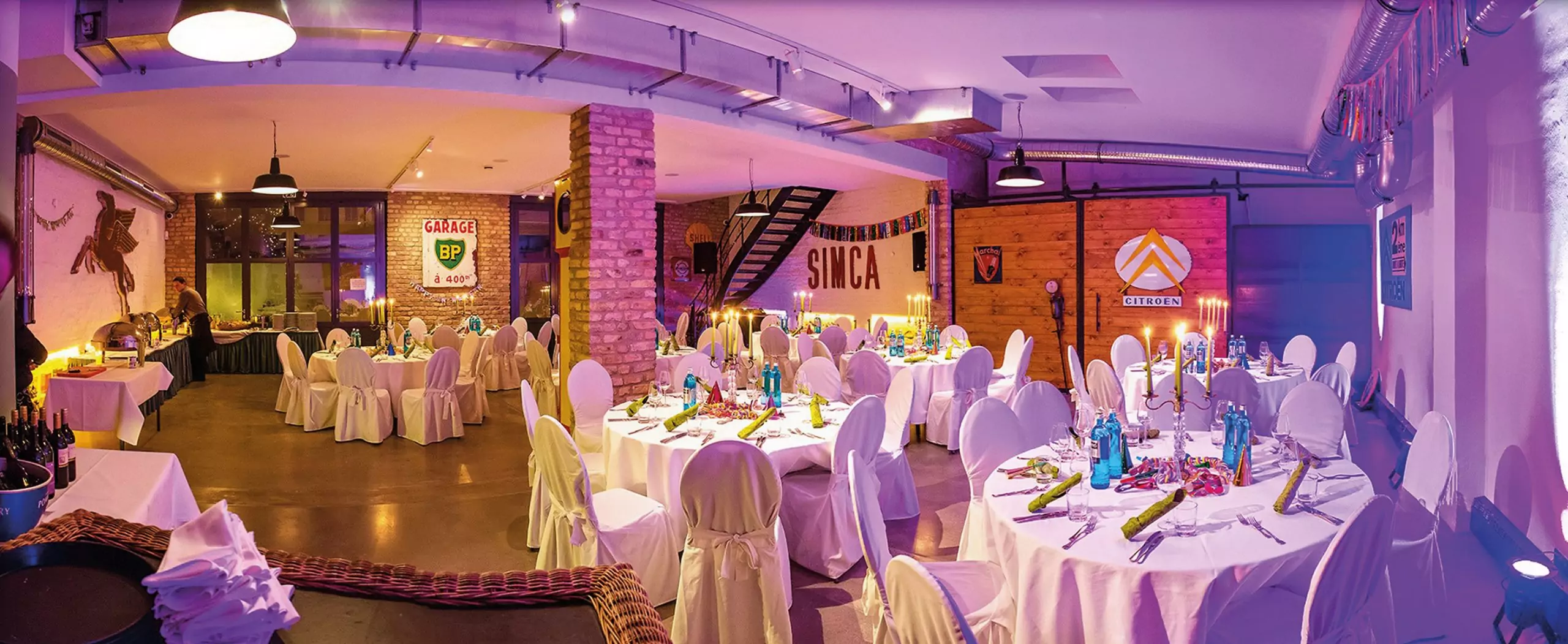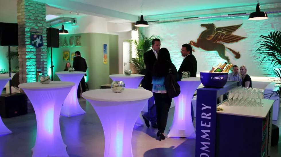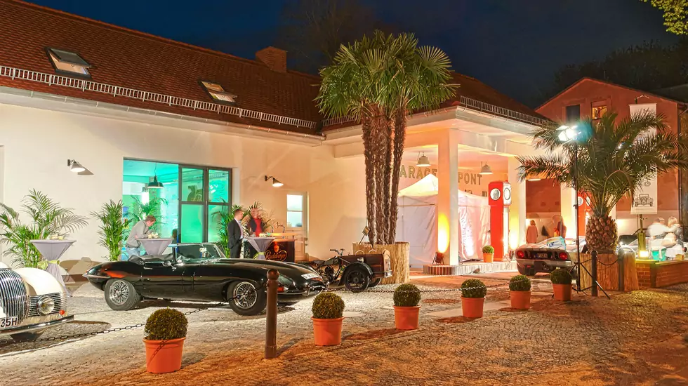 Die ehemalige Garage bietet Raum für individuelle Präsentationen und Feierlichkeiten. Überraschen Sie Ihre Gäste mit einer coolen Chill-Out-Area zwischen Oldtimern oder empfangen Sie bis zu 90 Gäste in klassischer Bankettbestuhlung zu einem exklusiven Dinner.