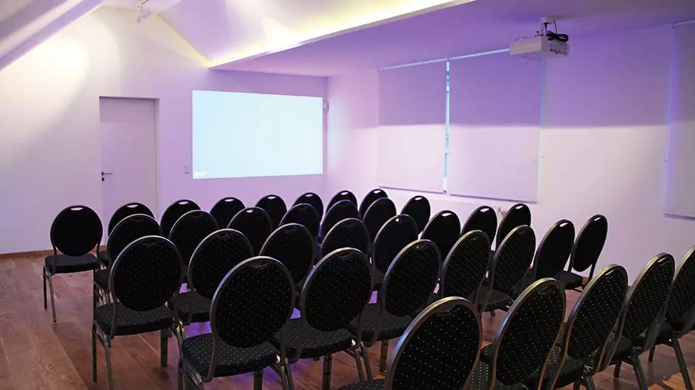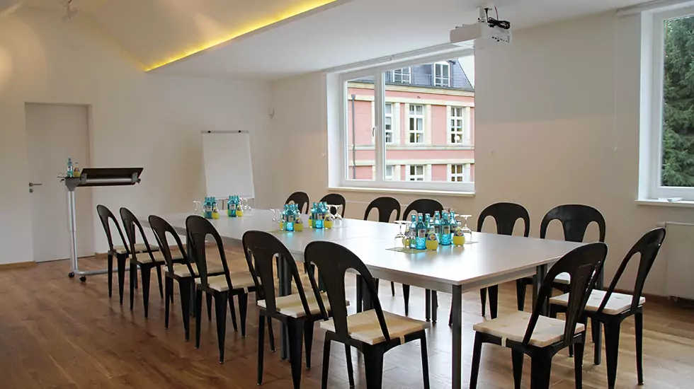 Ausgestattet mit Beamer und klassischer Tagungsbestuhlung ist der Seminarraum im Obergeschoss der ideale Ort für Präsentationen, Film-Vorführungen und kleine Tagungen. In Kombination mit der Weinlounge nebenan eignet sich unser Tagungsraum aber auch hervorragend als Tanzfläche für Ihre private Party, Ihr Firmen-Event oder als Buffetraum.